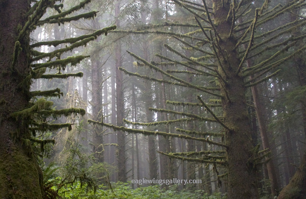 Nearby the misty trees reach out with moss covered feelers to touch one another.