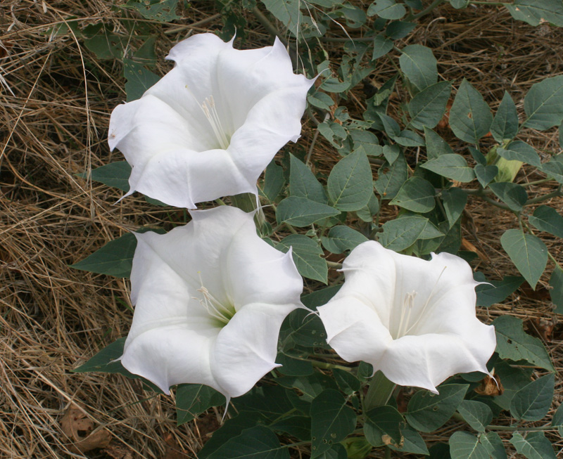A bee gathers pollen from the poisonous plant. I wonder if they sell a Jimson honey? Probably call it something else like, local or organic?
